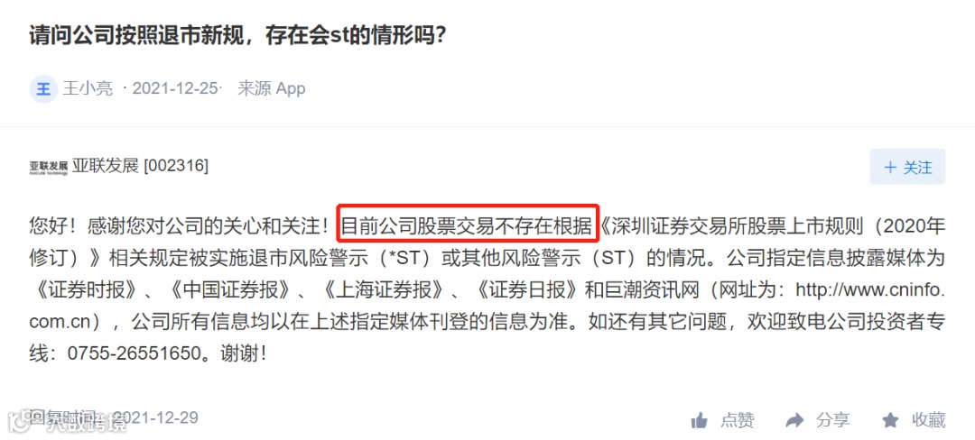 然而,一个月前,在公司股价还没怎么上涨的时候,公司在互动平台可不是这么对投资者说的。当时有投资者在互动平台问,按照退市新规公司存在ST的情形吗?公司当时可是斩钉截铁的说,公司股票交易不存在相关规定被ST的情形。