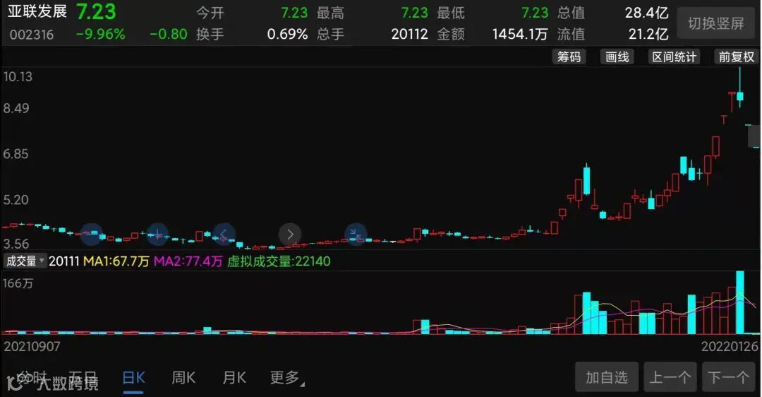 2021年10月28日,亚联发展盘中最低触及3.56元,创2021年5月以来新低,期间最大跌幅超45%。从10月29日开始小碎步震荡上涨,数字经济十四五规划发布后几天,12月21日、22日、23日、24日连拉4个涨停板,大涨近9成,连跌3天后开启主升浪行情,股价从4.58元一路涨到最高10.13元,大涨超120%,累计涨幅达185%。