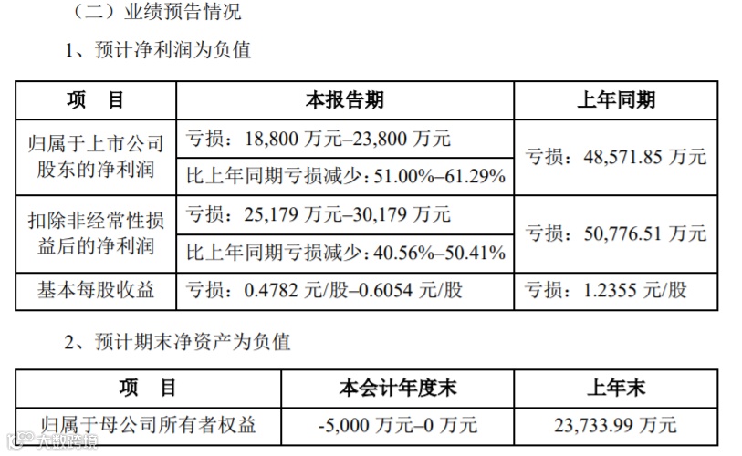 1月23日晚间,公司发布2021年业绩预告,归母净利润亏损1.88亿-2.38亿,同比减少51%-61.29%,扣非净利润亏损2.52亿-3.02亿,同比减少40.56%-50.41%,预计净资产为-5000万元-0万元。