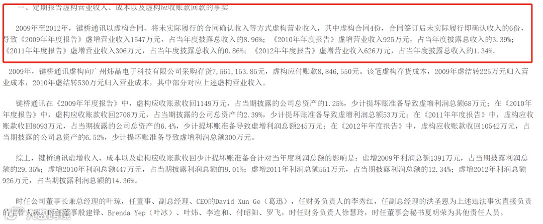 然而,2015年3月2日深圳证监局发布的一份行政处罚决定书却显示,2009年-2012年键桥通讯虚构合同、将未实际履行合同确认收入等方式分别虚构营收1547万、925万、306万、626万,存在重大对外贷款未及时入账披露、重大对外担保未及时披露等违法事实。