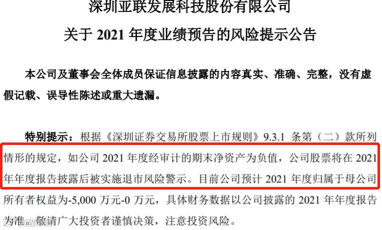 比业绩亏损让人害怕的是公司股票可能被ST,但比股票被ST还要可怕的是,在这波数字经济炒作行情当中,亚联发展竟然故意隐瞒了公司可能连续3年亏损、2021年净资产为负,股票存在被ST的风险的事实!