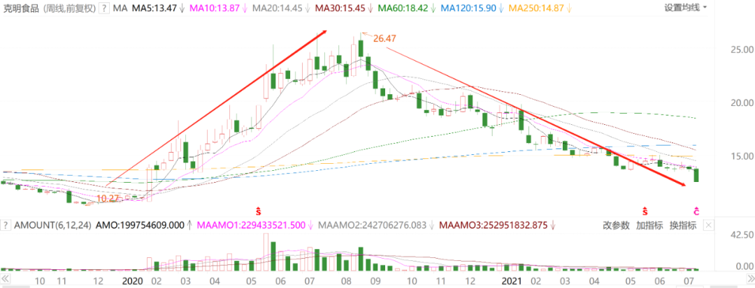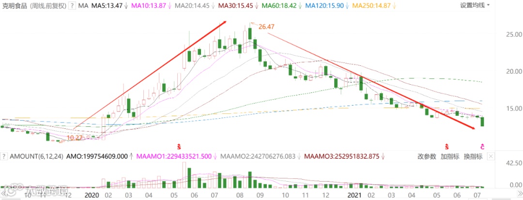 不过疫情消退之后,克明食品股价明显没了动力,2020年9月之后股价就一路走低。如今从26元多跌到了12元多,股价不到一年就腰斩!