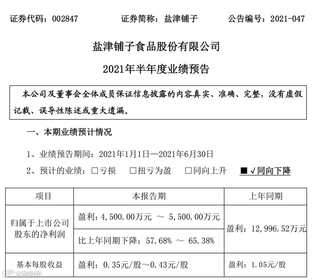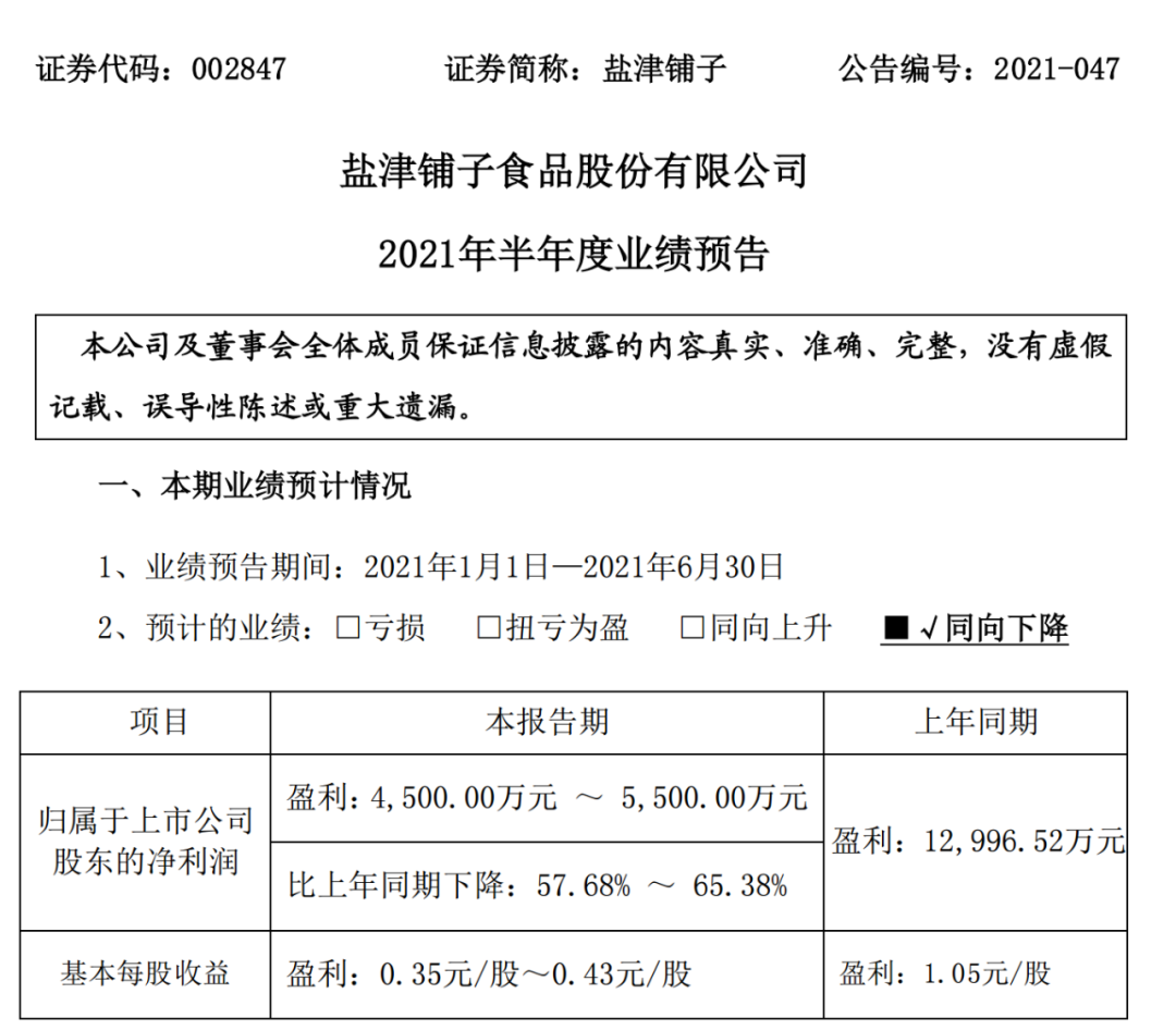 7月15日,盐津铺子(002847.SZ)发布2021年半年报,当期公司实现归属净利润4500万元-5500万元,同比下降65.38%-57.68%。