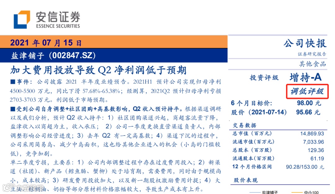 安信证券主要指出,受公司自身调整、社区团购、高基数、加大费用投放的影响,盐津铺子业绩出现了下滑,因此给出调低评级的报告,把目标股价调整为98元。