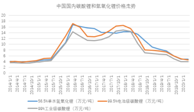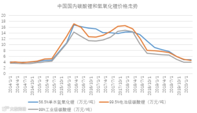 然而,从2018年初开始锂产品价格进入下降通道,至2019年底碳酸锂价格已跌至4.8万-5.1万区间,氢氧化锂价格也跌至4.7万-5.1万区间。