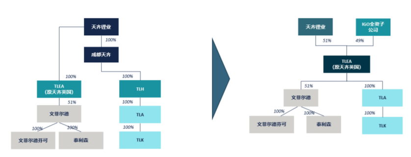 2020年12月8日公司决定,拟以增资扩股的方式引入战略投资者澳大利亚IGO,入股旗下全资子公司TLEA(原天齐锂业英国)。增资入股完成后,天齐锂业持股TLEA 51%,IGO旗下全资子公司IGO Lithium Holdings Pty Ltd持股49%。