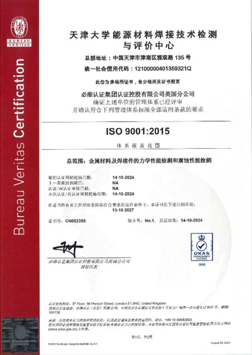 近日,必维集团(Bureau Veritas,以下简称“必维”)授予天津大学能源材料焊接技术检测与评价中心(以下简称“中心”)ISO 9001:2015质量管理体系认证证书。此次获证不仅标志着天津大学在能源材料焊接技术领域的质量管理水平得到了国际权威认可,而且对于提升该校在该领域的科研实力和全球竞争力具有深远影响。