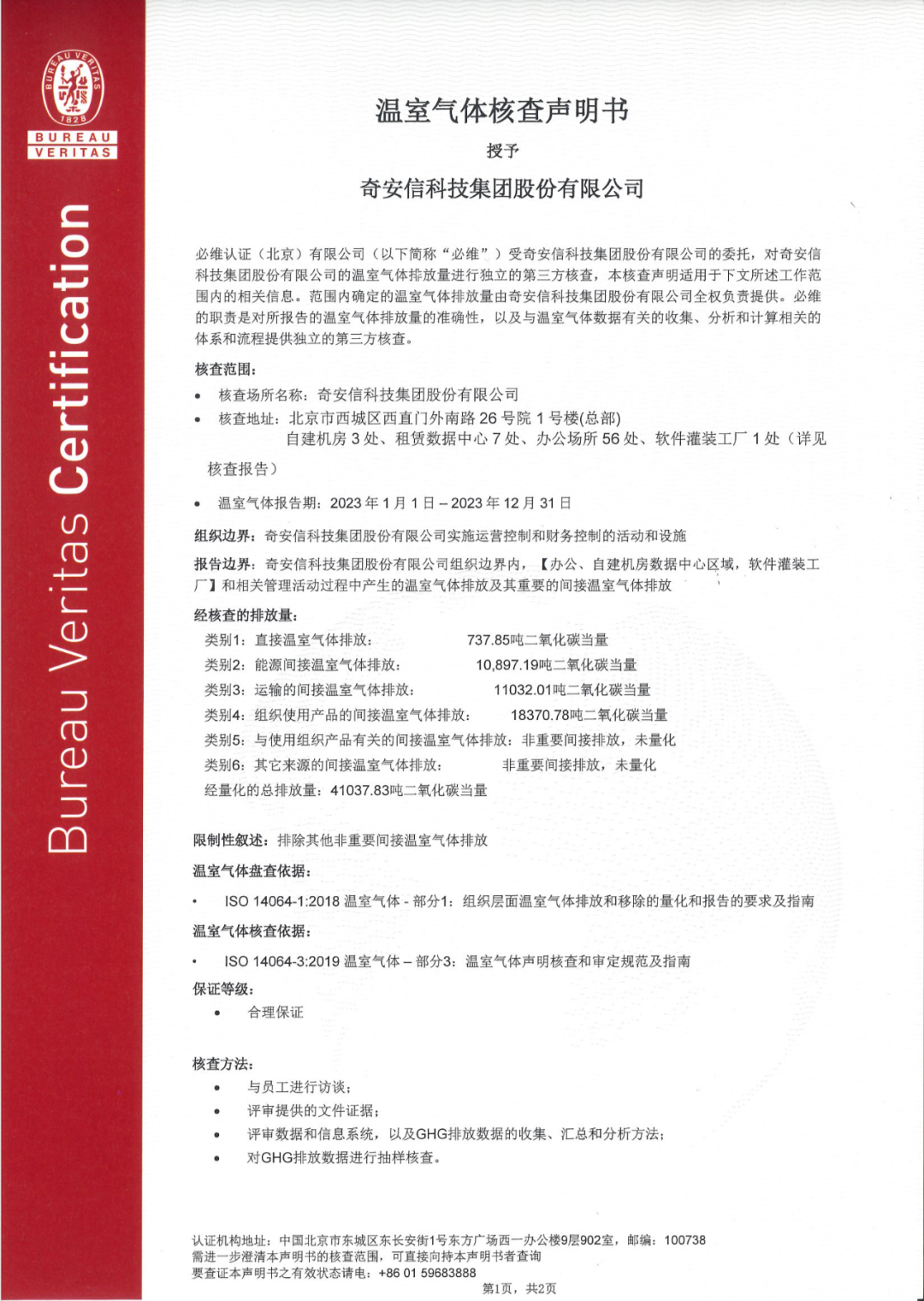 作为奇安信在可持续发展道路上的合作伙伴,必维集团(Bureau Veritas,以下简称“必维”)此次除了为奇安信ESG报告提供第三方验证并颁发独立鉴证报告之外,还对其ESG报告中所披露的温室气体排放量的准确性,以及温室气体数据收集、分析和计算相关体系和流程进行审核,并最终颁发了独立的第三方温室气体核查声明书,展示其在环境保护、绿色可持续发展等方面的承诺。
