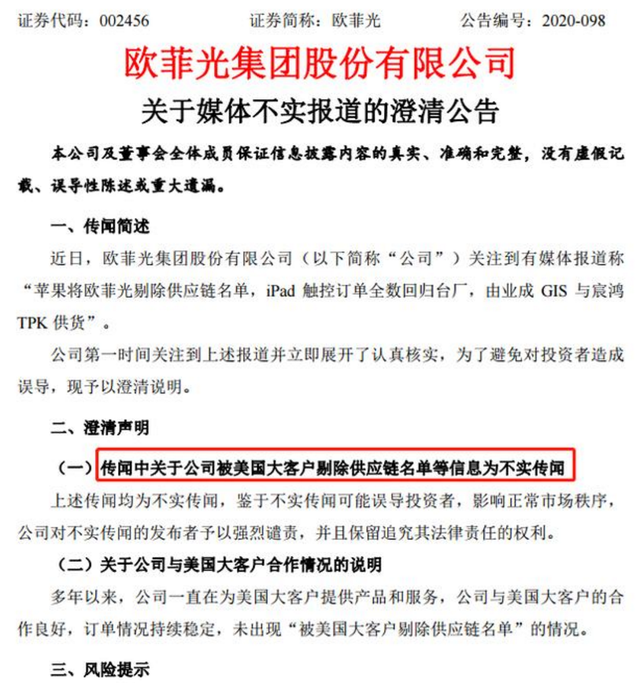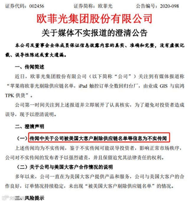 当时的欧菲光,甚至还对“不实传闻”的发布者予以强烈谴责,并且保留追究其法律责任的权利。