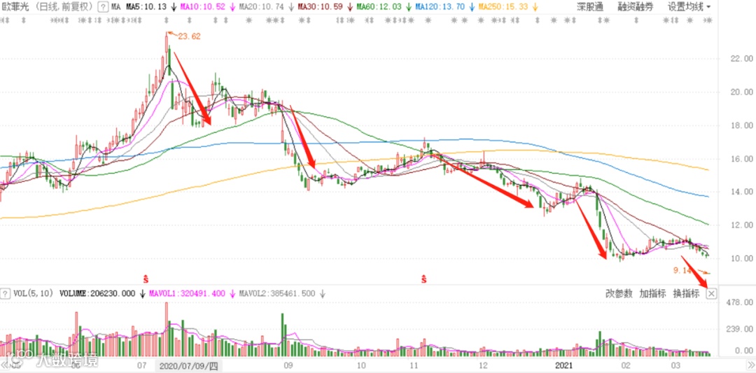 欧菲光自2020年7月被美国商务部列入实体清单以来,股价便呈现节节下滑的态势。从23元以上一路跌到9元,8个月跌幅高达60%。