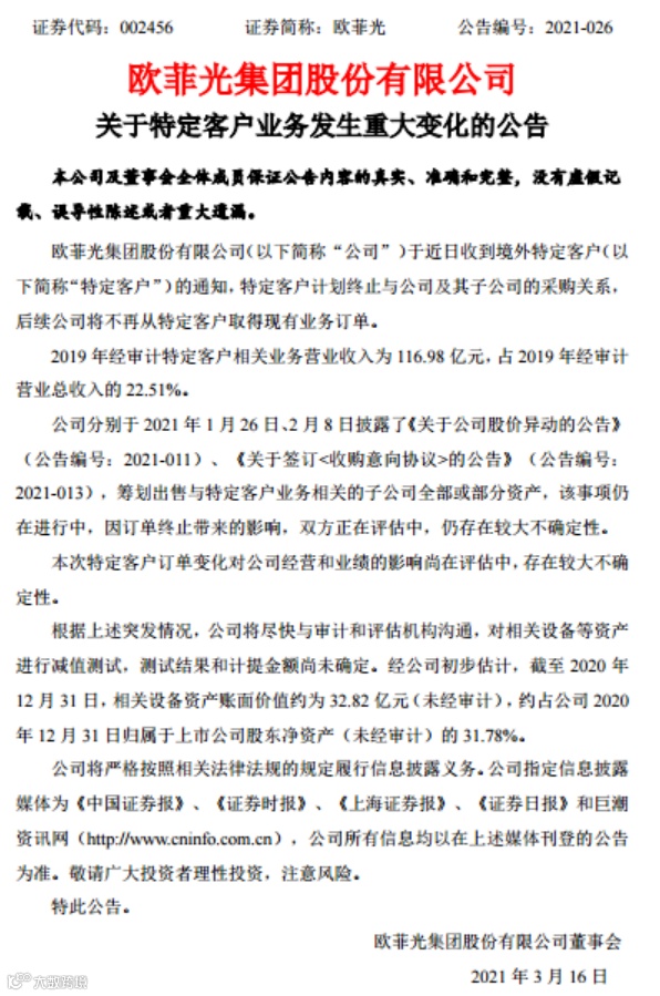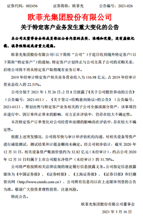 3月16日晚,欧菲光(002456.SZ)发布《关于特定客户业务发生重大变化的公告》称,公司近日收到境外特定客户的通知,特定客户计划终止与公司及其子公司的采购关系,后续欧菲光将不再从特定客户取得现有业务订单。