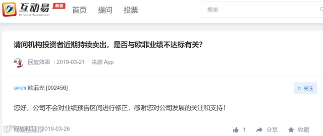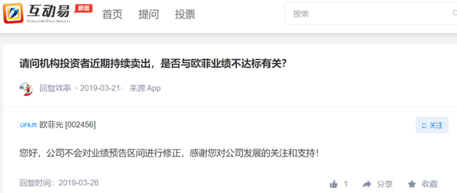为了让投资者放心,欧菲光的高管在当年3月26日深交所互动易上回答“请问机构投资者近期持续卖出,是否与欧菲光业绩不达标有关“的问题时,也言之凿凿地说,公司不会对业绩预告区间进行修正。