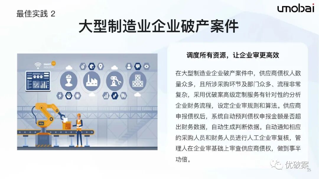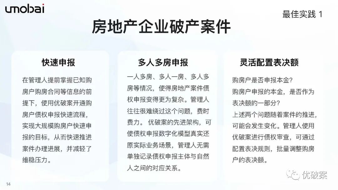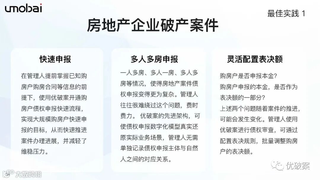 优破案自推出以来,历经九载,深耕破产领域,针对房地产、大型制造业、个债清理、上市公司、跨境破产、合并破产等不同行业、领域的破产案件,结合各地管理人的实际需求提出了多个创新的解决方案,为管理人更高效的履职提供无限可能性,连续数年有案件入选最高院、各地法院破产审判典型案例以及各省管理人优秀履职案例(部分案例详见列表)。