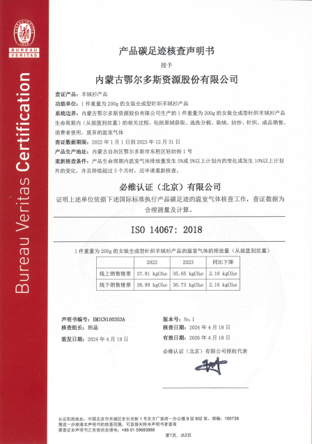 全球气候变化已经成为全世界共同面临的挑战与重大问题,积极应对气候变化、实现碳中和目标已成为全球共识。通过产品碳足迹的测算,鄂尔多斯看到了现阶段向低碳转型的成果及需要进一步加强投入的工作方向。未来,鄂尔多斯将继续优化能源结构、加快向清洁能源转型,深化绿色技术及工艺的开发与应用,坚定不移的落实自身低碳行动。同时,也将通过产业链和品牌的链接,推广可持续理念,携手价值链伙伴和消费者共同推进可持续行动,为实现“双碳”目标持续努力。