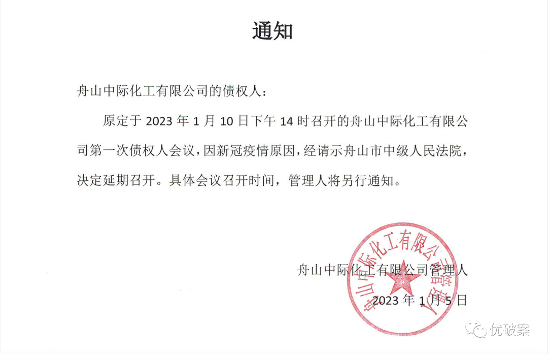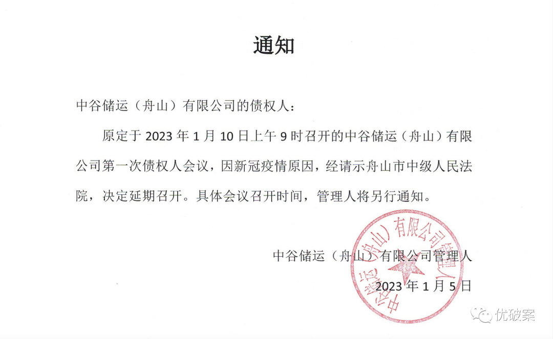 原定于2023年1月10日上午9时召开的中谷储运(舟山)有限公司第一次债权人会议,因新冠疫情原因,经请示舟山市中级人民法院,决定延期召开。具体会议召开时间,管理人将另行通知。