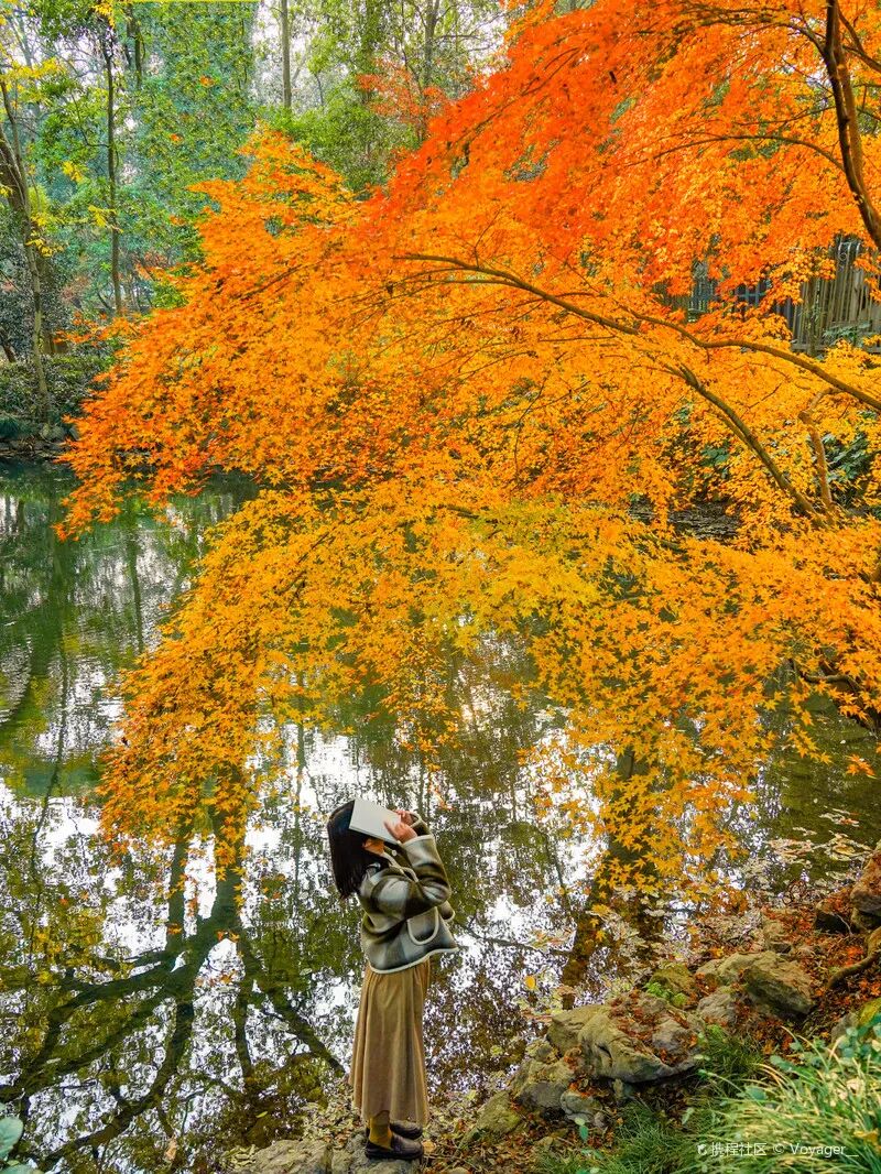 极具中式审美的公园在红叶的装点下更显得多姿,比较经典的拍照机位有虎跑放生池、玉带池、撷翠轩等地,池水湖畔红枫环绕,锦鲤在水中来去自如,一如水中红叶,在“江南第一茶”大茶壶旁的枫树号称“枫叶王”,粗壮的树干、遮天蔽日的枝叶同样令人震撼。
