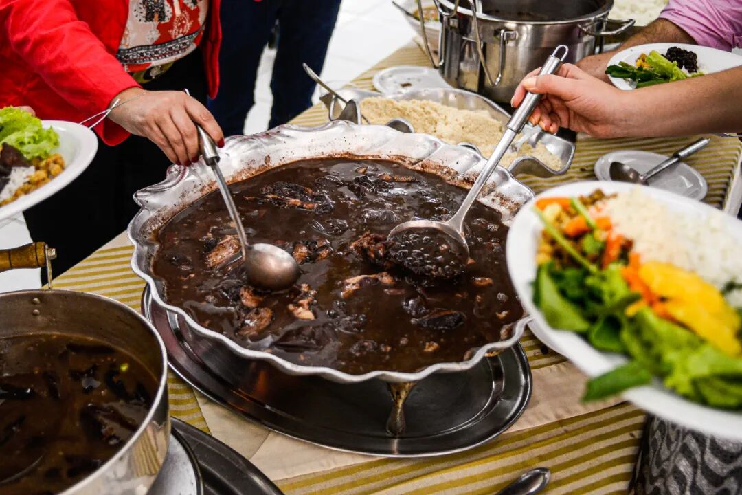 用各种豆子搭配猪肉制作成饭食就是一道美味的巴西国菜“豆饭”,其中尤以黑豆饭较为普遍,这样的吃法在巴西已有数百年历史,炖煮好的豆子炖肉汤汁浓厚,各家各户风味均有所不同,加入不同的食材,味道更是千变万化,这道菜肴早已深入到每一位巴西人的日常生活中。