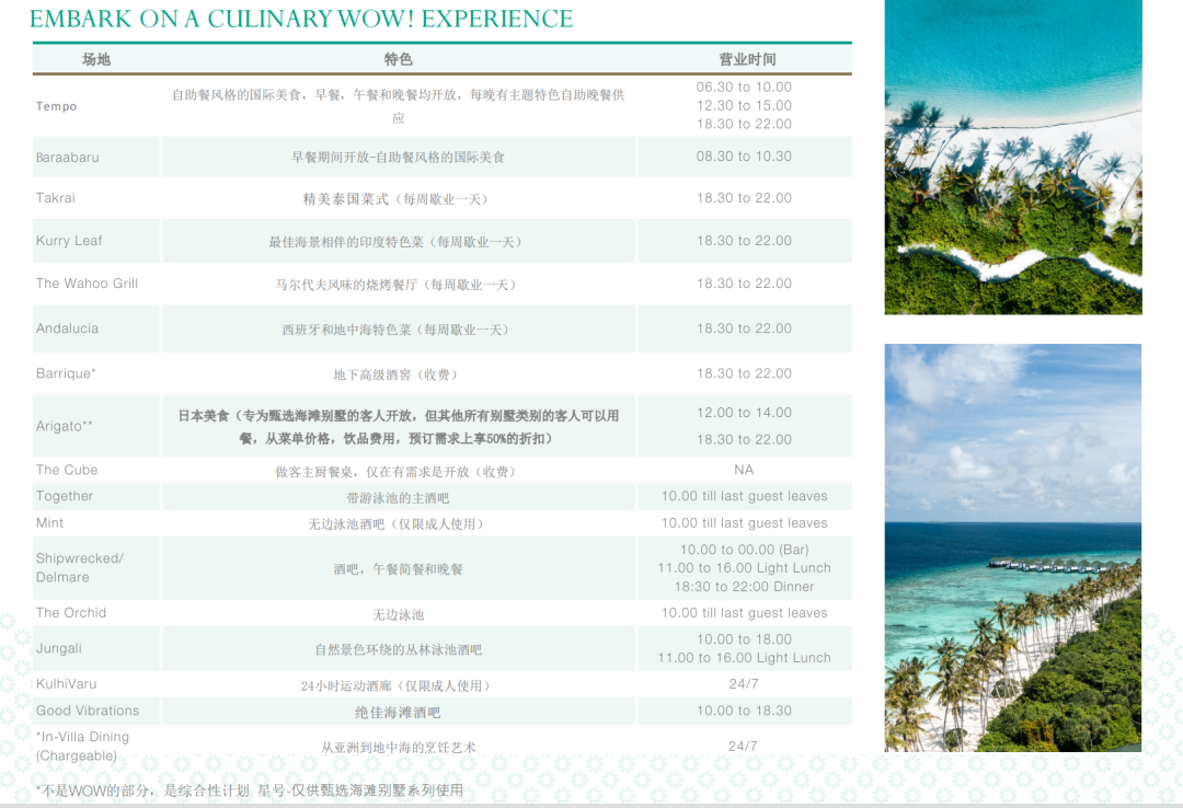 目前整个集团品牌时刻包含:WOW欢迎礼遇、极致蜜月之旅、马尔代夫之文化展示、Sun Siyam海滩俱乐部、寻宝之旅、月光影院、开夜床仪式、秘境落日酒会、网红别墅打卡出片、纯素至臻飨宴、移动冰品驿站。