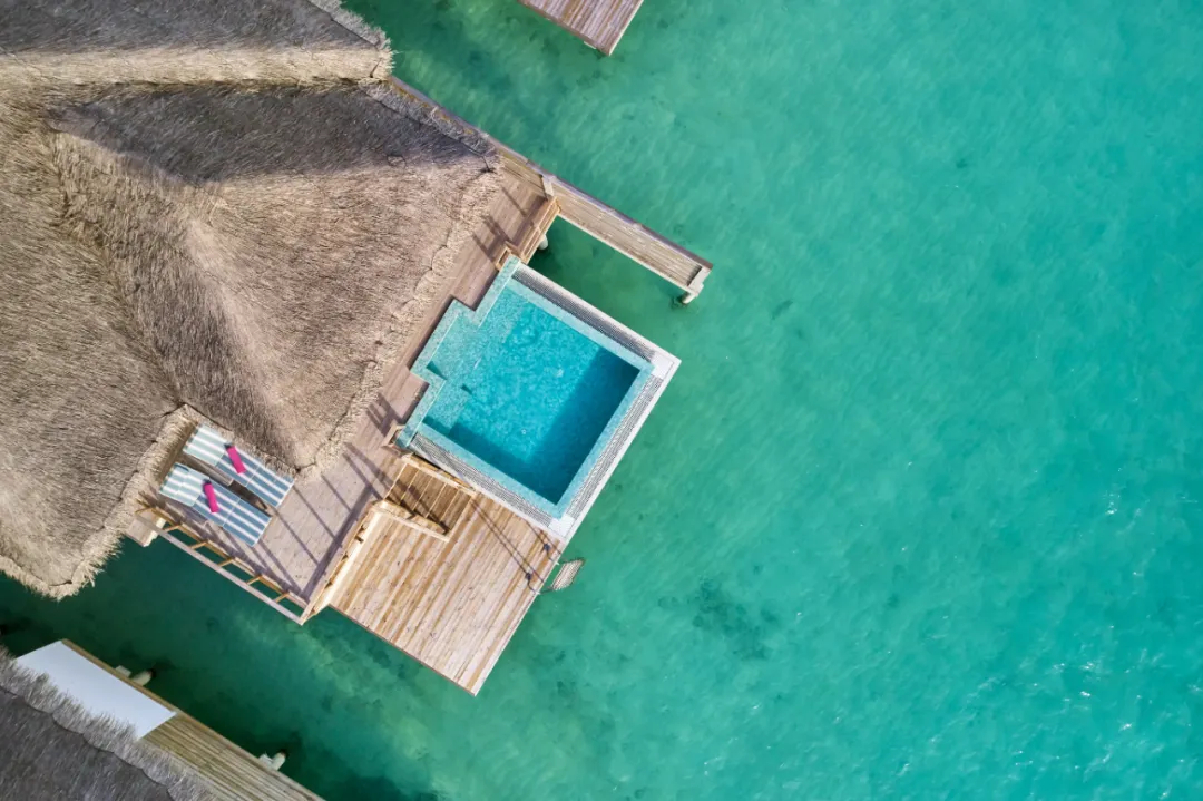 属于轻奢六星岛,被南尼兰德环礁的蓝色海洋包围,一栋栋的别墅栖息在海滩与泻湖间,美得超级不真实,就像是来到了天堂。