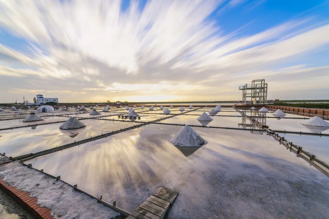 一望无垠的盐田间是纵横交错的阡陌小道,就像拼接整齐的马赛克方块,行走在阡陌上,每块盐田中堆着一座小盐山,上下水天一色,还能体验传统晒盐、挑盐,盐田周围许多小吃店内提供特色盐制饼干、盐水豆花与盐冰激凌等,高浓度盐水让豆花变得更加嫩滑,口感非常独到。