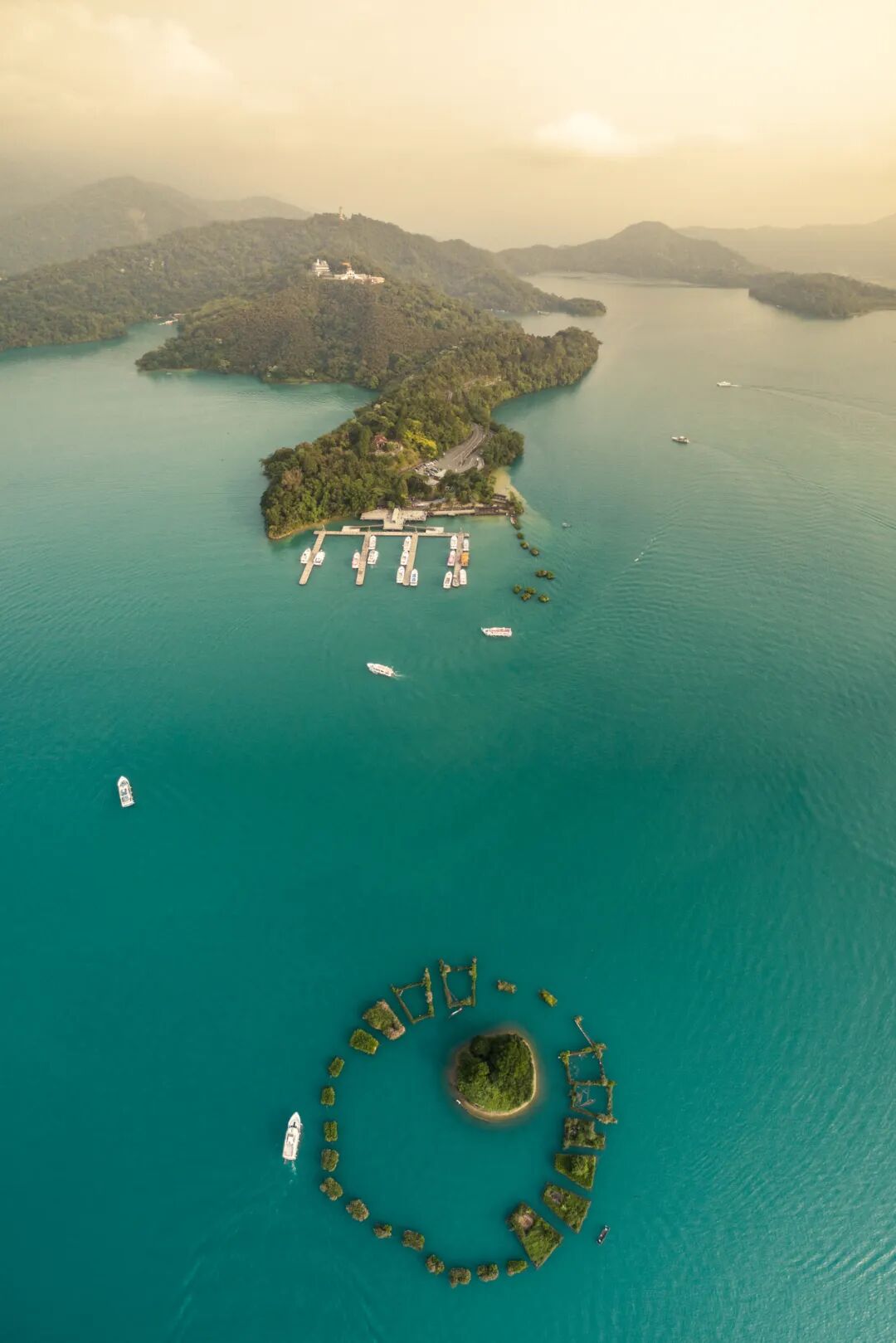 在群山之间,是蜿蜒的江湖峡谷,不算长的河流、不算大的湖泊,点缀在群山中,平添一丝旖旎与惬意,苍翠森林中一汪湖水碧波荡漾,湖中岛将其一分为二,一半日潭,一半月潭,湖水碧绿澄澈,小学课本中的日月潭终于得以亲眼一见。