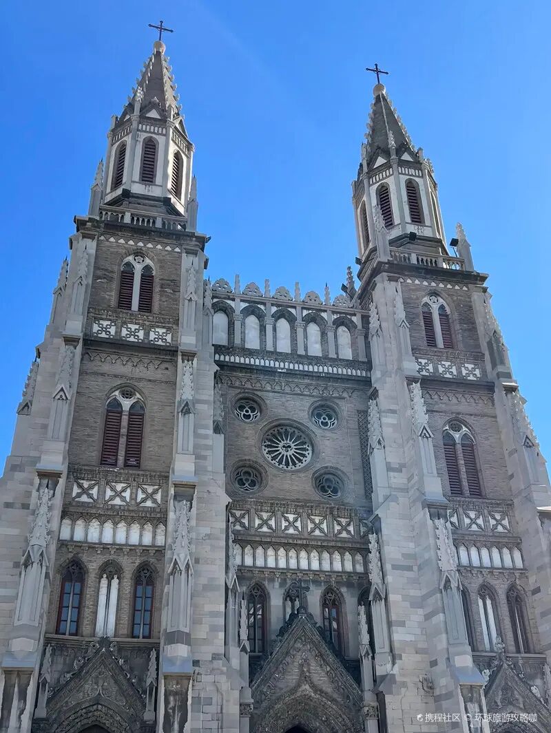 从老商埠出发大约25分钟左右的路程,洪家楼天主教堂是济南地标般的存在,同时也是济南最有欧洲风情的建筑之一,教堂双塔高耸而立,哥特式建筑神秘而庄严,矗立在济南城一隅,细看石墙上的龙纹与雕花,中西建筑美学的碰撞让这座教堂大放异彩。