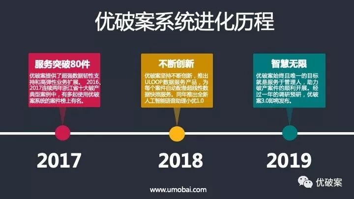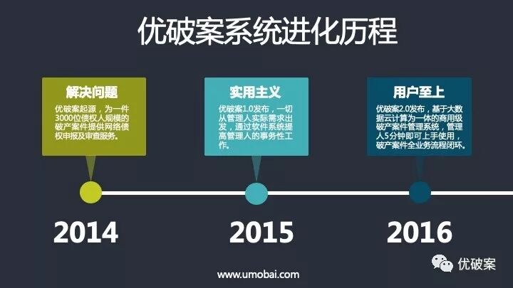 优莫百破产案件管理系统(以下简称“优破案系统”)3.0大版本主要突出专业服务与科技创新。自优破案系统2014年诞生起,产品研发始终建立在以人为本、大胆创新的基础上,核心目标是协助法院及管理人不断优化破产案件办理流程,简化事务性工作,为破产案件提供高质量专业服务。