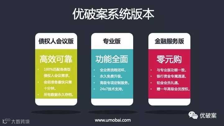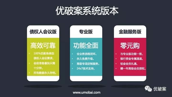 优破案系统3.0将会同时发布3个版本:债权人会议版、专业版及金融服务版。与此同时,所有现有案件的管理人用户将全部默认升级至3.0专业版,畅享所有新服务新科技,升级时间另行通知。