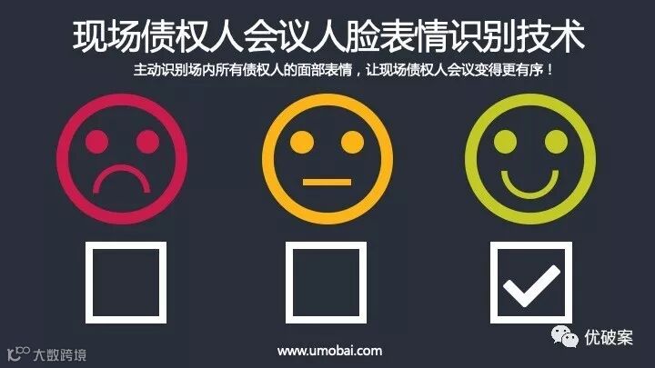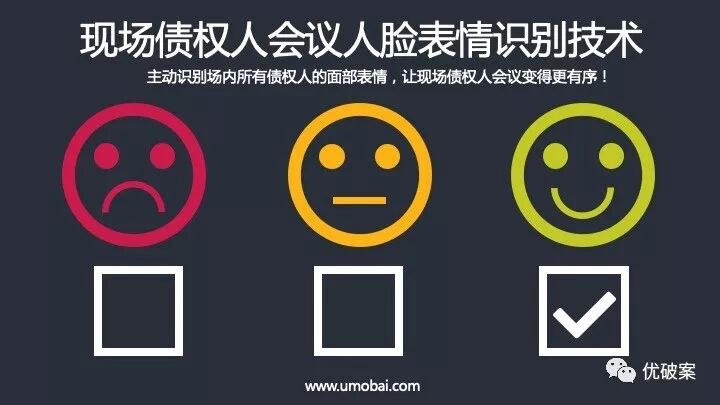 对于召开现场债权人会议,优破案系统3.0深入细节,用科技解决维稳需求,首创基于人工智能的现场债权人会议人脸表情识别技术,主动识别场内所有债权人的面部表情,让现场债权人会议变得更有序,且不侵犯隐私。