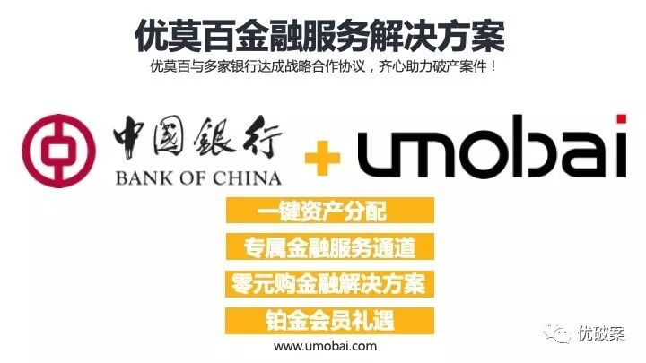 优莫百正式推出金融服务解决方案,与多家银行开展合作,齐心助力破产案件。其中,中国银行是第一家与优莫百正式达成战略合作协议的银行。无论是技术还是服务,均能全方位的满足用户对银行金融方面的需求。