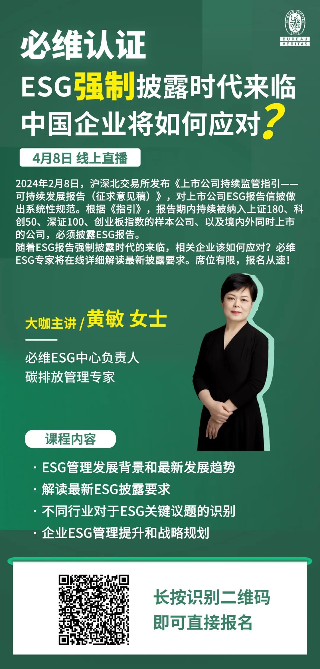必维ESG专家认为本次意见稿的出台会极大地促进企业可持续发展ESG报告的数量和质量,同时也会有更多的中国公司,特别是上市企业,因为政策因素或同行压力而发布报告。随着ESG报告强制披露时代的来临,相关企业该如何应对?4月8日必维ESG专家将在线详细解读最新披露要求。席位有限,敬请预约报名!