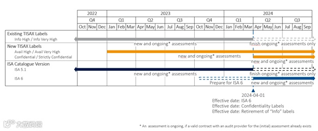 在 2024 年 4 月 1 日之前评估状态为“ordered”的新 TISAX 评估程序仍将使用“Info” TISAX 评估目标。一旦评估符合 TISAX 标签的条件,所有地点都将自动获得 “Confidential”标签,并且对于“Info Very High”, “strictly confidential”标签作为附加标签。