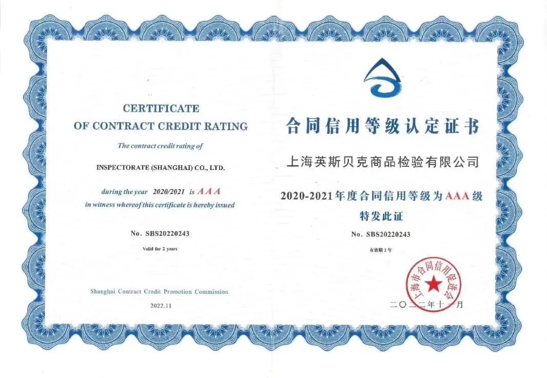 近日,上海英斯贝克商品检验有限公司(简称“英斯贝克“)凭借良好的企业信誉和行业公信力,荣获上海市合同信用促进会评选的“2020-2021年度上海市守合同重信用企业”,并被授予AAA级信用等级。