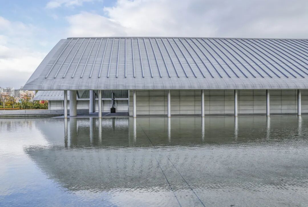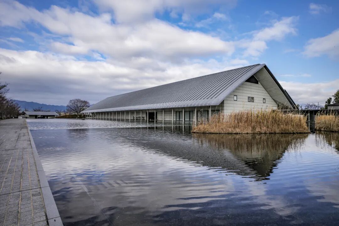 滋贺守山市琵琶湖畔,矗立着3座被水庭环绕的山形屋顶建筑——佐川美术馆,站在远处看,好似漂浮在水面上,因此又被称为“水上飘浮美术馆”。