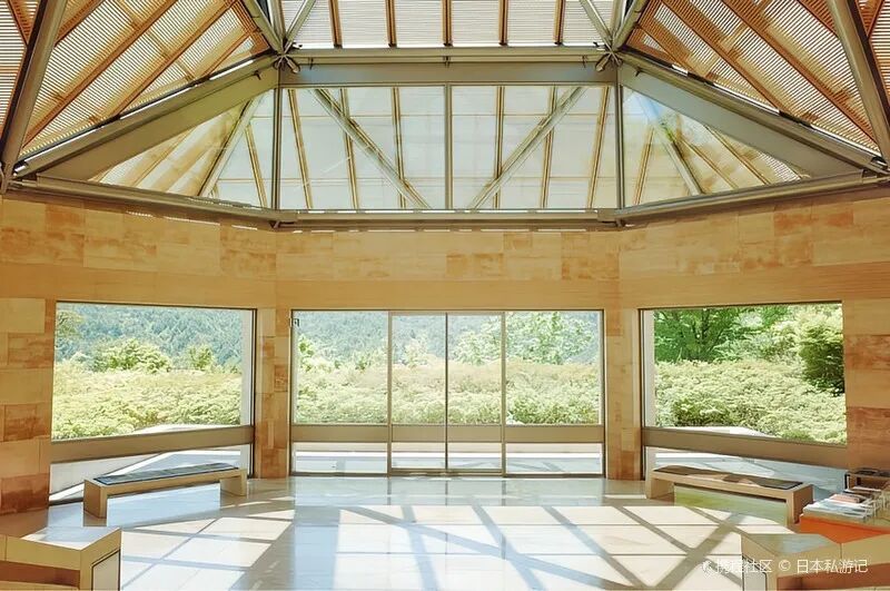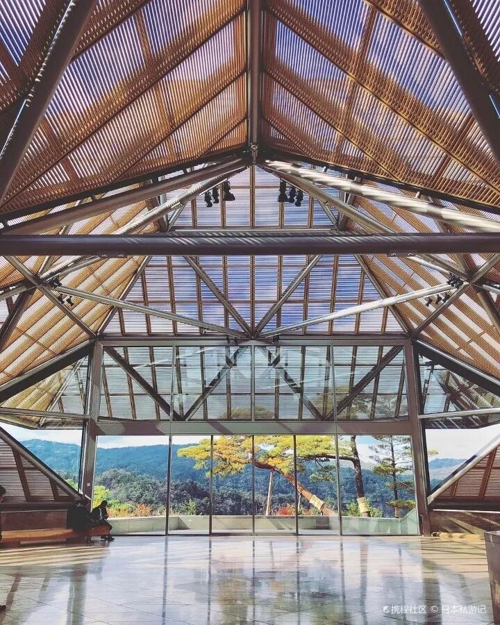 美术馆主体建筑则与信乐山岳融为一体,巨大的玻璃穹顶在松林间若隐若现;阳光透过格子幕墙洒落一室,光影随之倾斜浮动,打在蜂蜜色的墙面或地板上,增添了一抹几何空间美感。