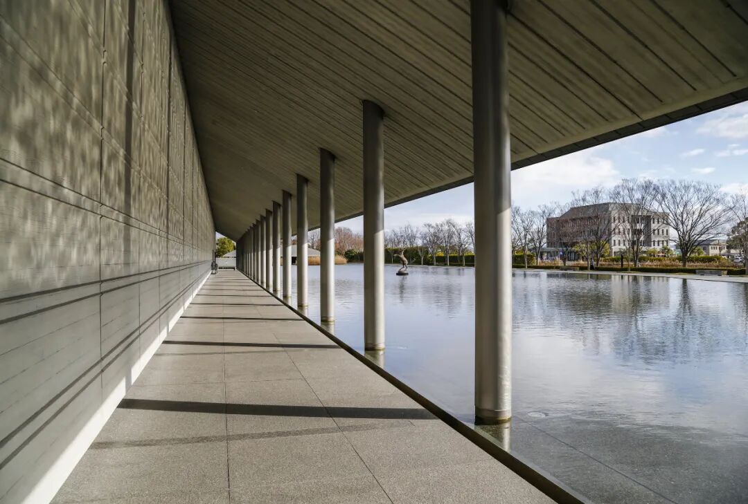 靠近美术馆,蓝天、流云、绿树、比叡山倒影水面,与美术馆的灰色混凝土墙面相映成趣,勾勒出一幅极具日式现代设计特色的动态画卷。