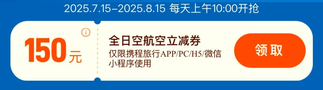 国际机票通用,机票票面金额满2000元可减100元,1500元可减50元,适用于通过携程APP预订的,起飞日期在2026年1月31日前的国际航线,也就是暑期、国庆、跨年都能用,券每天10点抢!