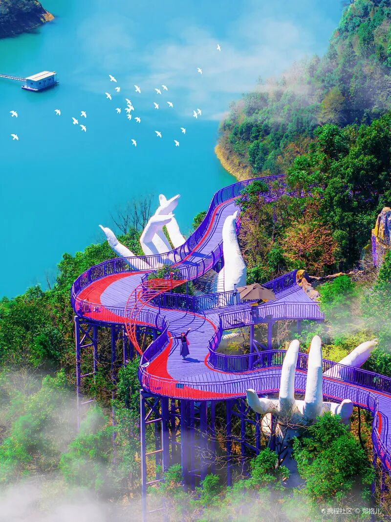 从起点处乘坐飞天魔毯下来后,第一站就是欢乐世界的区域,这里主要分为A区和B区,在A区即可打卡超级“网红”——紫绫纤手,巨大的“纤纤玉手”托起一条紫色栈道,仿佛神女托举着紫色披帛,山间雾气缭绕更为其增添几分神秘色彩,让人恍若闯入人间仙境。