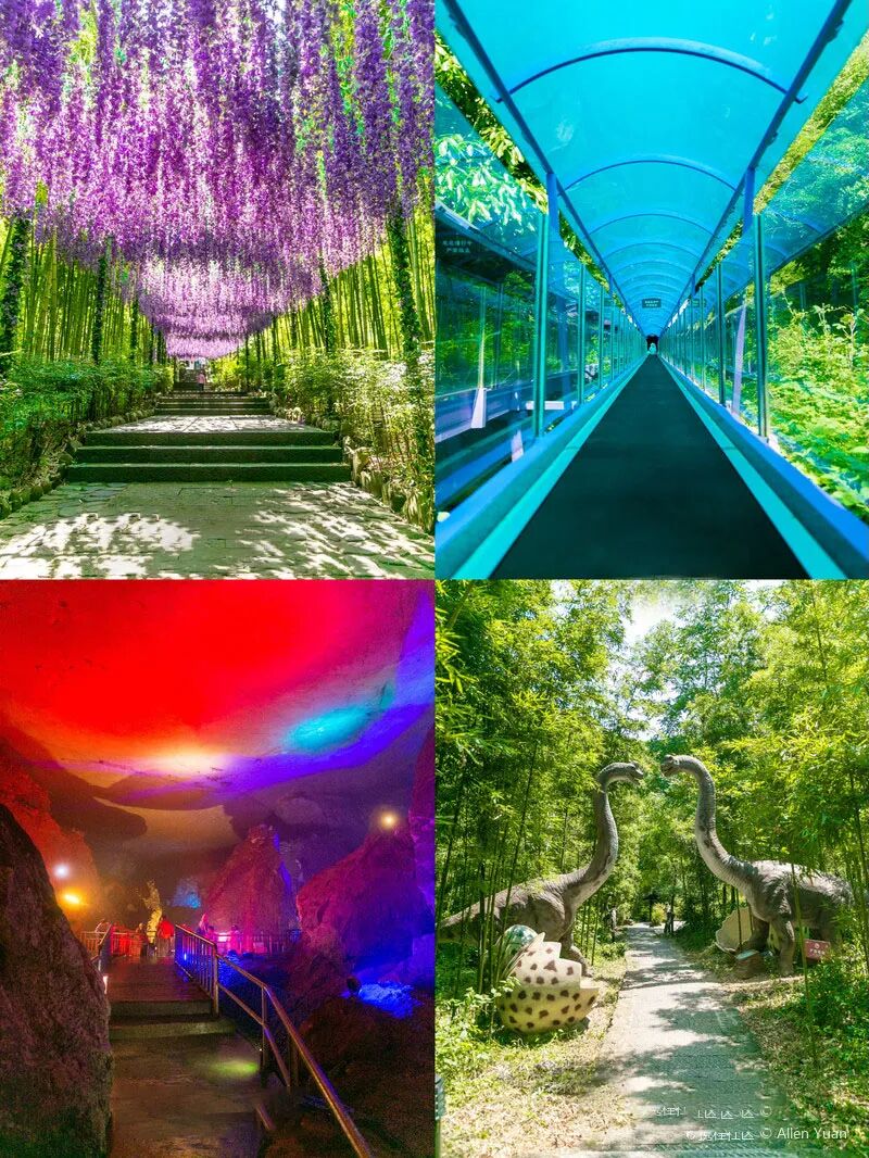 高铁直达桐庐站或千岛湖站,转乘每30分钟一趟的巴士就能直达景区。穿过美轮美奂的紫藤花廊(花期在4月-5月之间),乘坐飞天魔毯能够轻松滑上山顶,省时省力,完全不用自己爬山,堪称是“懒人福音”!
