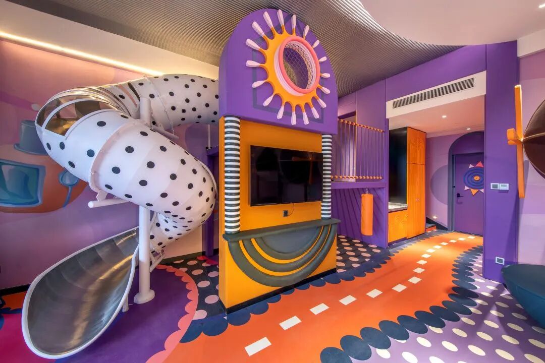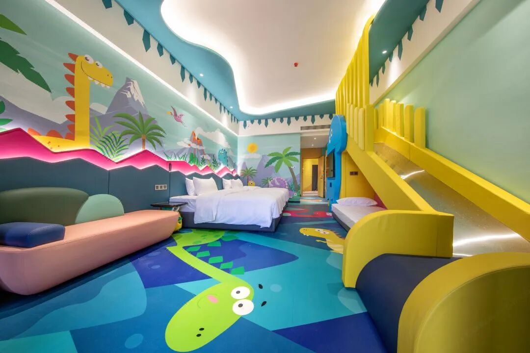 备受亲子家庭喜爱的房型还要数亲子区的马达加斯加、飞跃马达加斯加、爱丽丝奇境、火星登陆舱等房型,全都自带独立泡池和室内滑梯,堪称是小朋友们的最爱,童趣十足的装修风格也十分可爱,是暑期孩子们的梦想天堂。