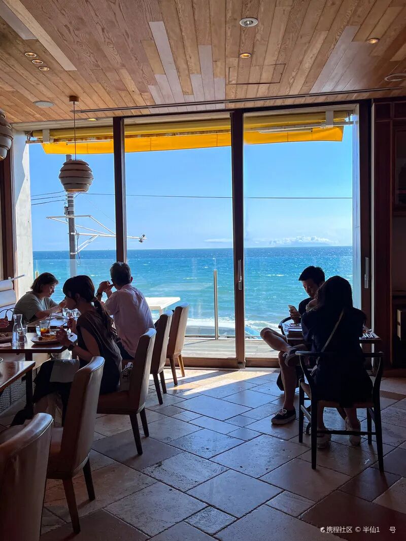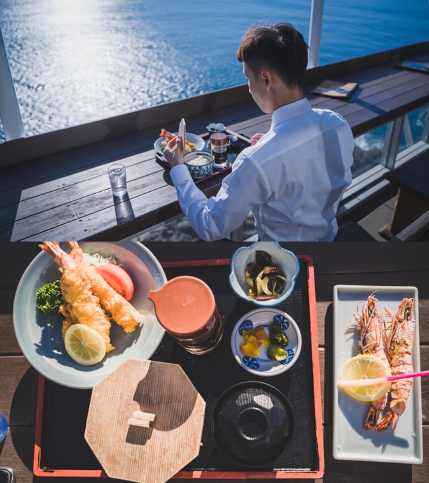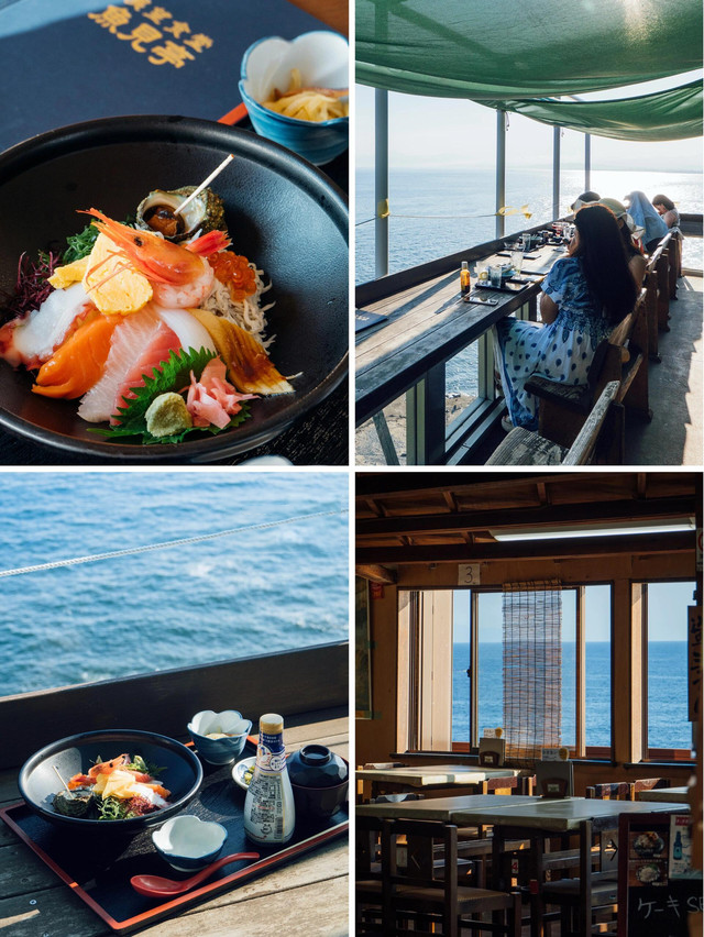 坐在餐厅的露台区域,耳边海风呼啸,眼前海浪翻滚、鹰击长空、红霞漫天,心神不由自主震荡;天晴时,富士山、伊豆半岛和大岛,亦能够一览无余;时不时再品味一下店内颇受好评的江之岛盖饭和烤鱼定食,搭配冰饮,超满足~