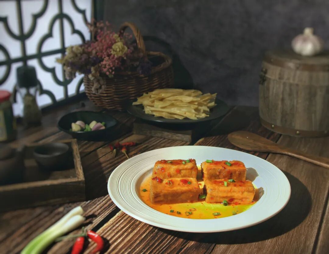 一道凤阳酿豆腐,乃朱元璋钦点的贡菜,是洪武宴的代表菜色之一,豆腐内塞入肉馅,烹制后外脆里嫩,味道酸甜,据说朱元璋年少时尤其喜爱这道菜。
