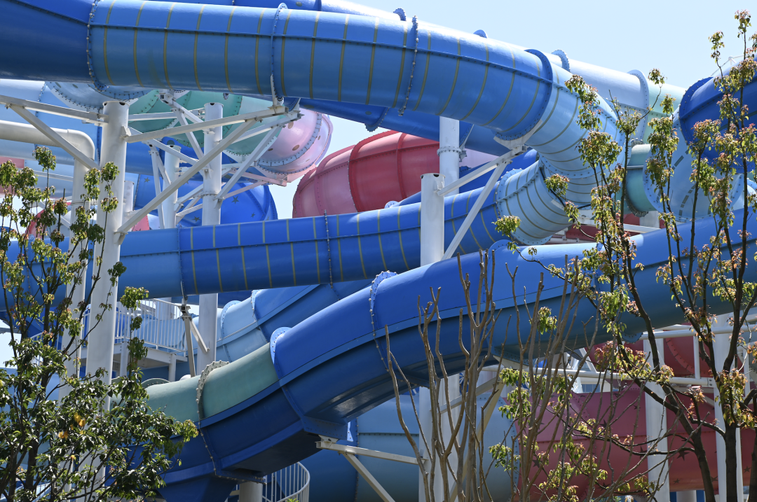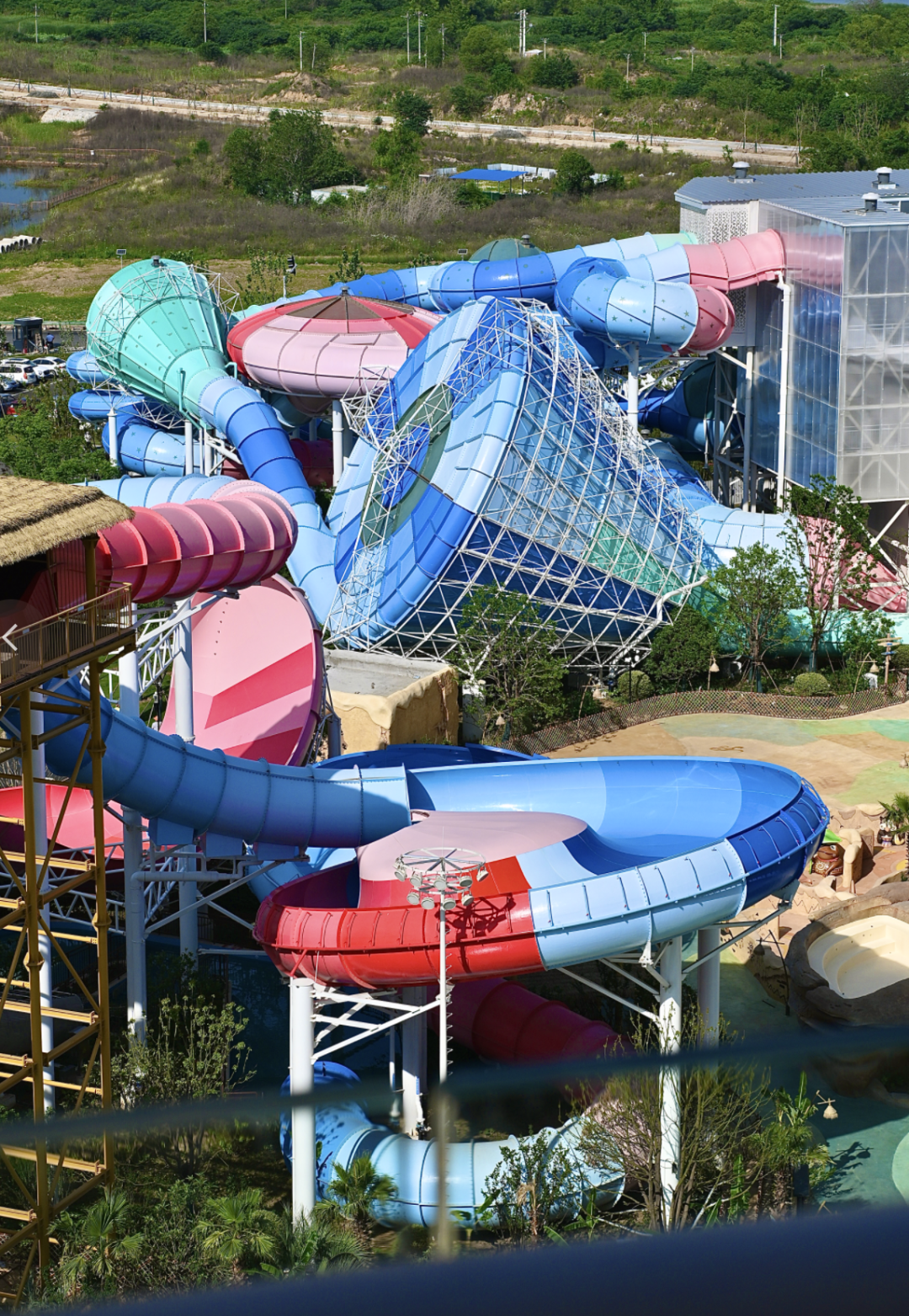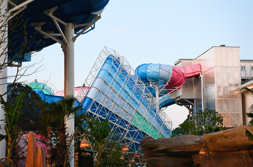 车行不久,隔着老远就能看到水乐园标志性的大喇叭滑道,简直还没到酒店就已经迫不及待想玩水了。