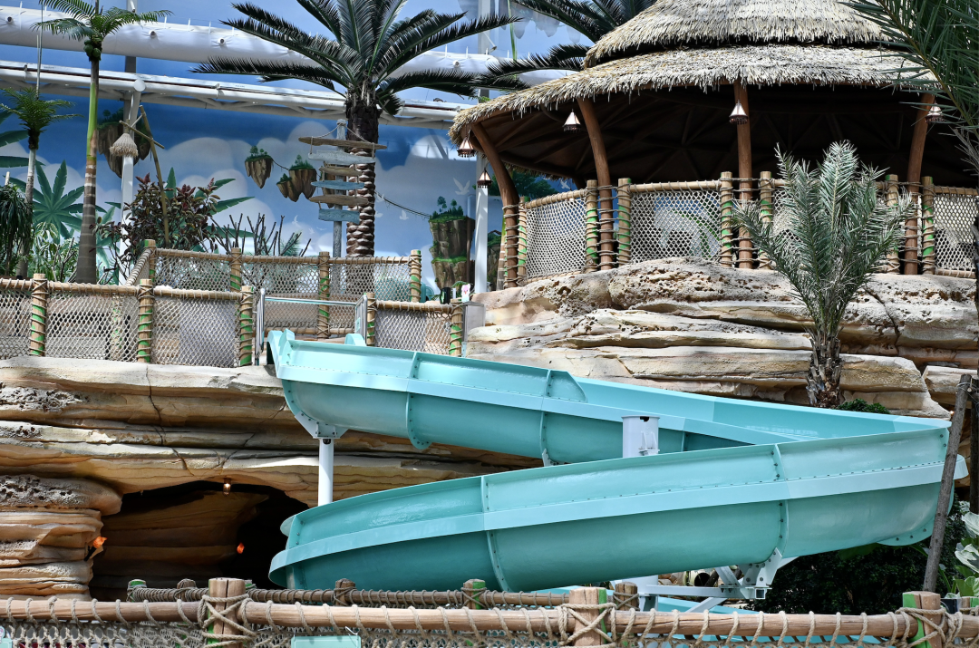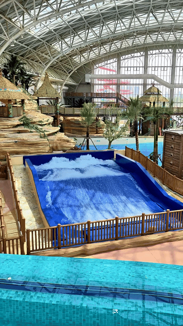 穿过门口的消毒区,就来到了巨型透明穹顶笼罩之下的室内水上乐园,水乐园还原了海岛的碧浪白沙,一秒穿越到东南亚。一年四季30度恒温,大夏天不热大冬天不冷,而且是全年龄可玩的。