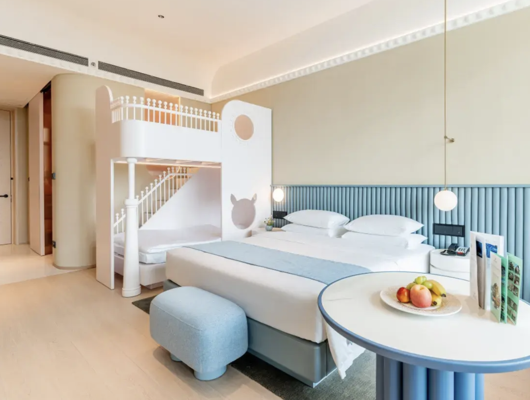 森趣亲子房除了大床外,还有上下双层儿童床,特别适合二孩家庭。