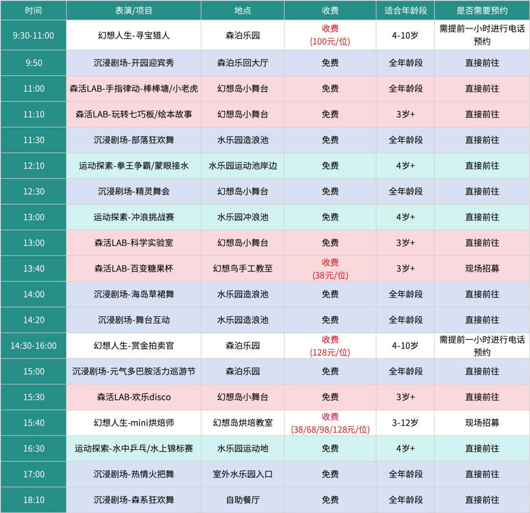 当然,森泊乐园和酒店里也有丰富的表演、活动,放一张时间表示意,具体排期已到店为准哈,亲测海岛草裙舞很欢乐~