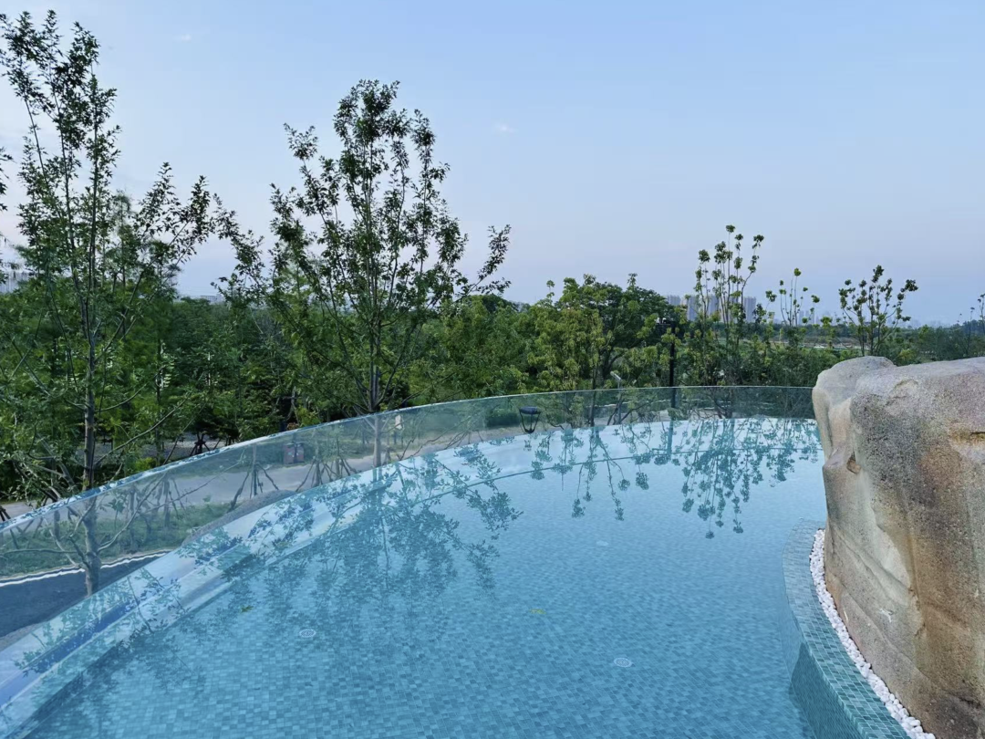 还有个颜值的无边泳池,藏在树影林间,玩累了可以来这里休息。