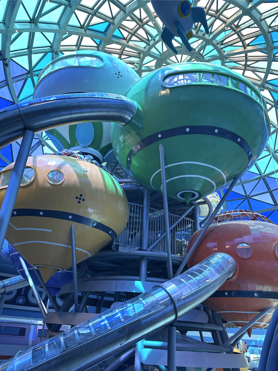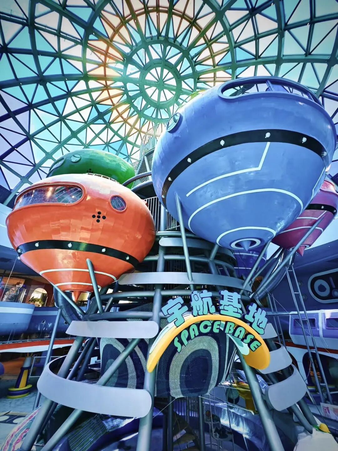 接下来是森泊的另一个招牌幻想岛儿童乐园,这家幻想岛以星际为主题,一入乐园好几层的热气球堡垒,我敢说看过那么多家森泊,没有一家有幻想岛这家震撼,赛博朋克的浓度超高。