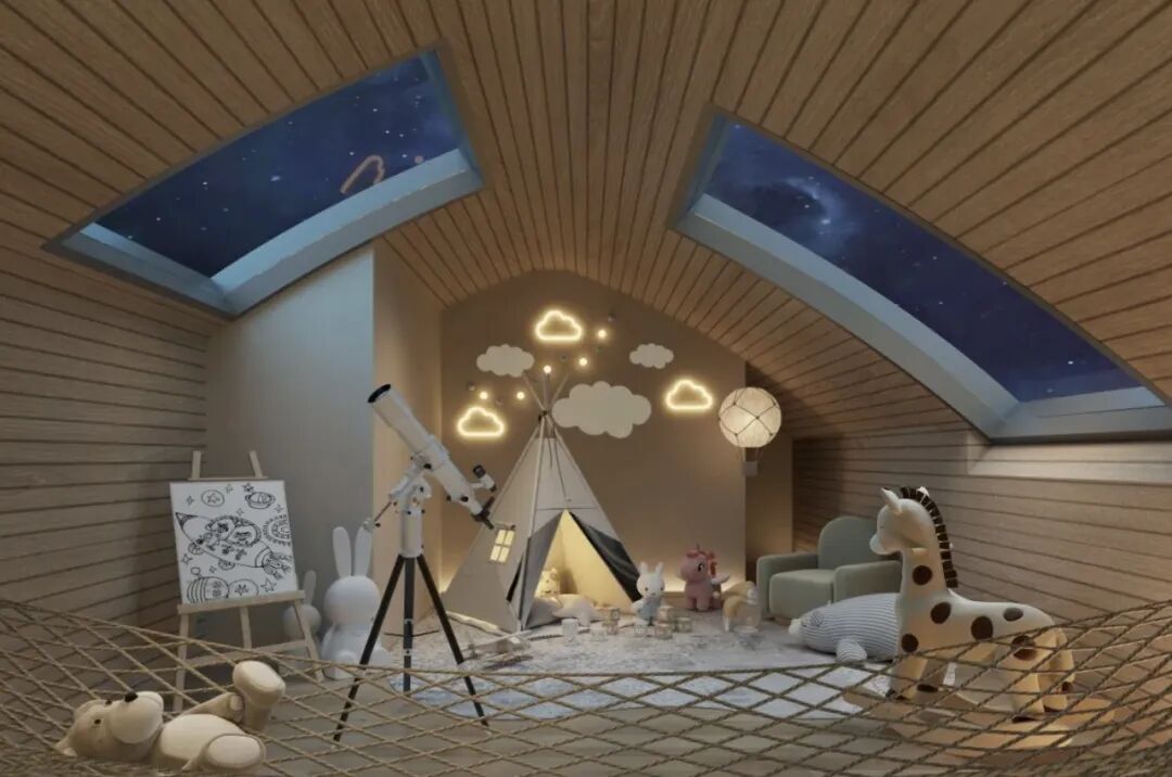 星梦复式双卧别墅,228平,除了双卧和客厅之外,孩子们还有个单独的游乐空间,有效帐篷、吊床、摇摇马,屋顶是玻璃窗,晚上透过望远镜可以看星空。