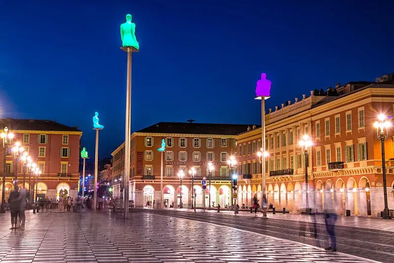 夜晚天色渐暗,这些雕塑们亮起不同颜色的灯光,点缀着尼斯的迷人夜色,每年尼斯狂欢节期间,盛大的花车游行都会从广场上浩浩荡荡而过,热闹的氛围点燃全城。